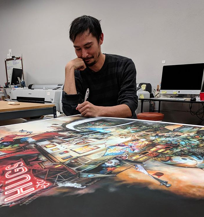 Born in 1978 from Mesa, AZ. he is a Japanese/American artist and freelance illustrator. He received his B.F.A. in NYC from The School of Visual Arts in 2000 and with his haunted subject matter and often-times colorful palate has established a career both in the fine art and commercial world. He is best known for his Surreal album artwork for the band Circa Survive and has produced numerous comic book covers for Vertigo Comics and designs for Deathwish and Baker Skateboards early in his career. Recently he has added mural work to his output and is also constructing some sculpted projects. He currently lives in Los Angeles pursing a life of art-making with his beautiful girlfriend Clare Bare, dog Soybean, and Gus the rabbit.
